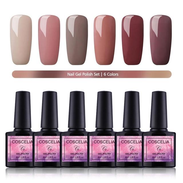 Набір гель лаків для манікюру з 6 кольорів. Пляшка пластикова, обсяг 8 мл. Лак густий, він дуже добре і рівно лягає в два шари, не розтікається. Через два тижні після нанесення на покритті не з'являється подряпин, тріщин, відколів.