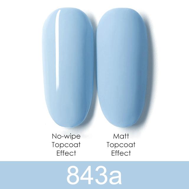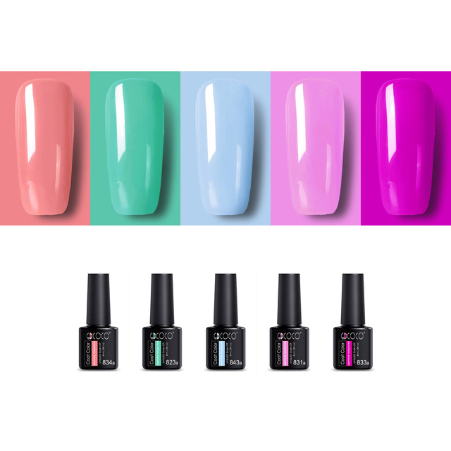 Набір гель лаків для манікюру з 5 кольорів. Пляшка пластикова, обсяг 8 мл. Лак густий, він дуже добре і рівно лягає в два шари, не розтікається. Через два тижні після нанесення на покритті не з'являється подряпин, тріщин, сколів.
