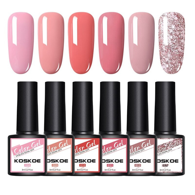 Набір гель лаків для манікюру з 6 кольорів. Пляшка пластикова, обсяг 8 мл. Лак густий, він дуже добре і рівно лягає в два шари, не розтікається. Через два тижні після нанесення на покритті не з'являється подряпин, тріщин, сколів.