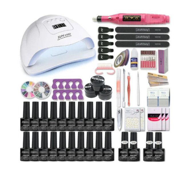 Стартовий набір для манікюру з лампою 120 W. У комплекті йдуть 18 різних гель лаків, 2 топи, 2 бази, фрезер та інше приладдя для манікюру та дизайну нігтів.